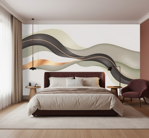 Ta minimalistyczna abstrakcja rezygnuje ze zbędnych detali, skupiając się na miękkich liniach i harmonii kolorów. Mural doskonale odnajdzie się we wnętrzach nowoczesnych i eklektycznych, stanowiąc eleganckie, a zarazem uspokajające tło dla sypialni, salonu czy nastrojowego gabinetu.