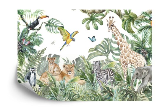 Fototapeta Children's Wallpaper, Watercolor Jungle And Animals. Lions, Giraffe, Elephant, Parrots, Zebra, Lemur