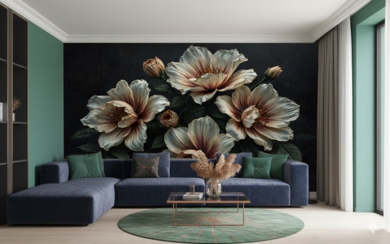 Elegancka fototapeta w stylu moody dark, przedstawiająca monumentalne piwonie na głębokim, ciemnym tle o subtelnej strukturze tkaniny. Kompozycja skupia się na artystycznym ujęciu detali – płatki kwiatów utrzymane są w szlachetnych odcieniach antycznego beżu i kości słoniowej, które kontrastują z wyraźnym, rdzawym żyłkowaniem.