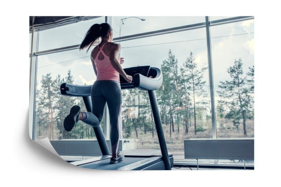 Fototapeta Kobieta Na Bieżni Z Krajobrazem Za Oknem