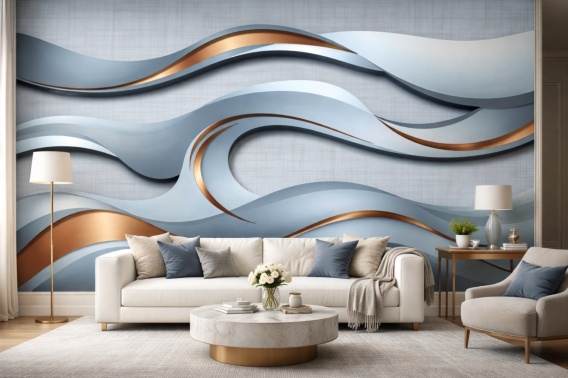 Ekskluzywna fototapeta z efektem 3D, łącząca w sobie elegancję gołębiego błękitu, szarości oraz lśniących akcentów w kolorze miedzi. Kompozycja opiera się na kontraście chłodnych tonów z ciepłym, metalicznym blaskiem płynnych wstęg, co tworzy dynamiczny i prestiżowy efekt dekoracyjny. Tło o delikatnej strukturze lnu nadaje całości szlachetnego wykończenia i dodatkowej głębi tekstylnej.
