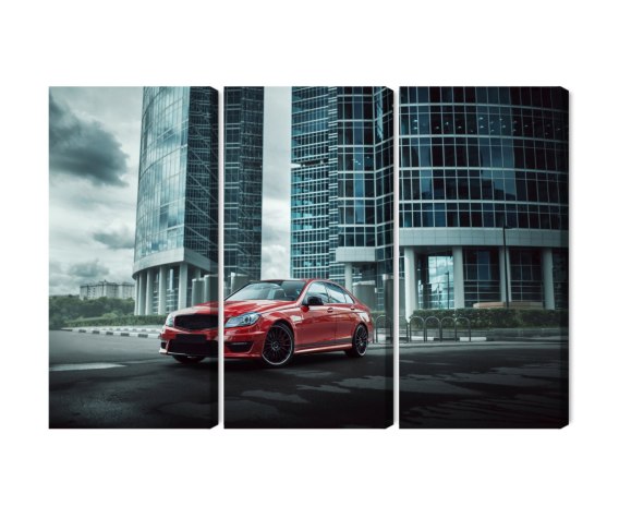 Obraz Wieloczęściowy Czerwony Samochód Na Tle Nowoczesnych Drapaczy Chmur