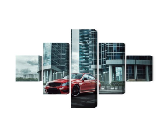 Obraz Wieloczęściowy Czerwony Samochód Na Tle Nowoczesnych Drapaczy Chmur