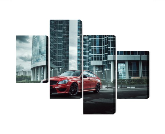 Obraz Wieloczęściowy Czerwony Samochód Na Tle Nowoczesnych Drapaczy Chmur