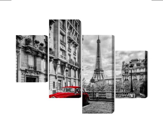 Obraz Wieloczęściowy Czerwony Samochód W Stylu Retro Na Tle Wieży Eiffla