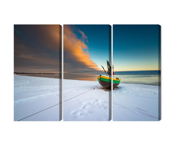 Obraz Wieloczęściowy Kuter Rybacki Na Zaśnieżonej Plaży W Sopocie
