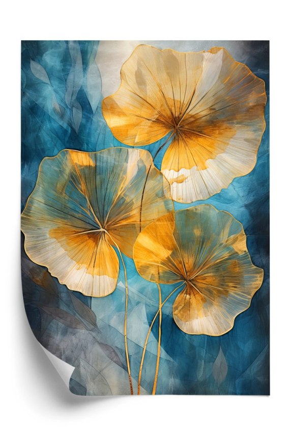 Plakat Abstrakcja Złote Liście Na Niebieskim Tle