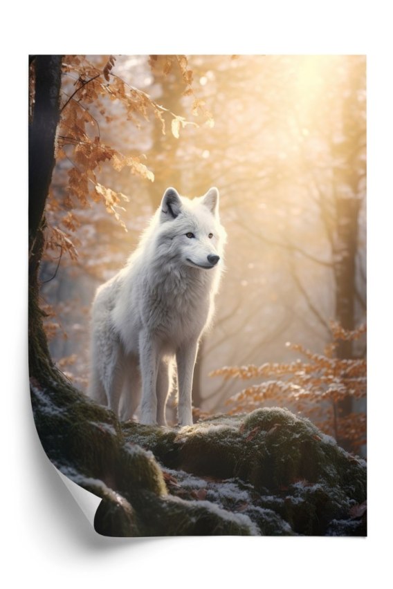 Plakat Biały Wilk Stojący Na Skale W Lesie