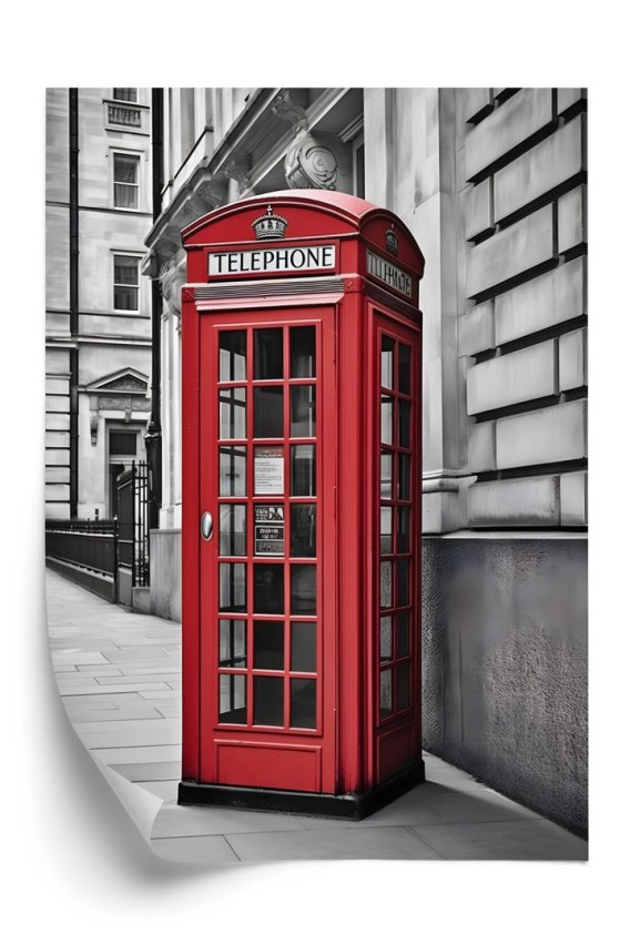 Plakat Czerwona Budka Telefoniczna Na Czarno Białej Ulicy