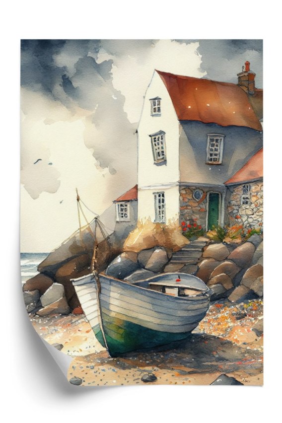Plakat Drewniana Łódka Na Akwarelowym Wybrzeżu