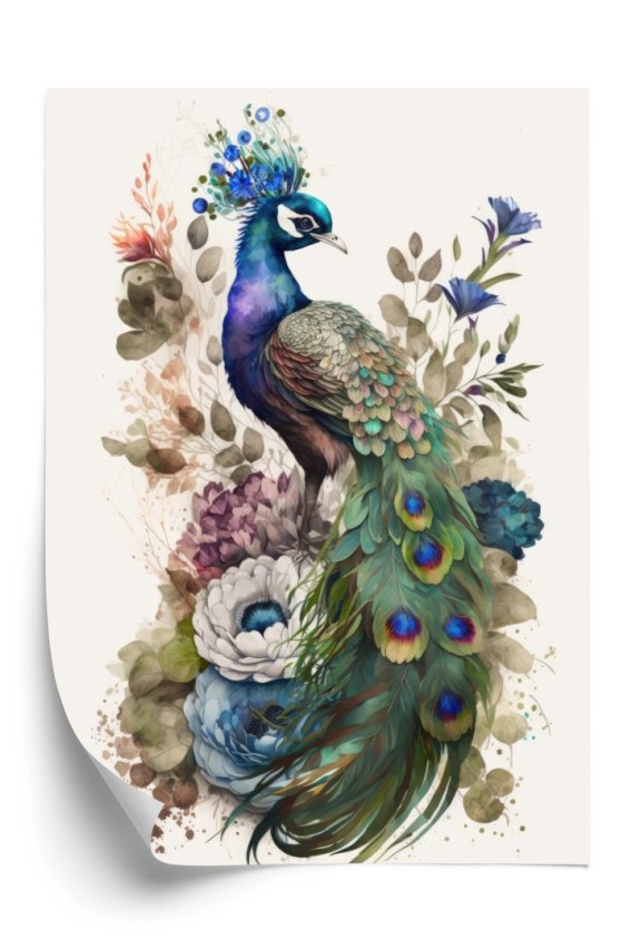 Plakat Elegancka Grafika Z Kwiatami I Pawiem