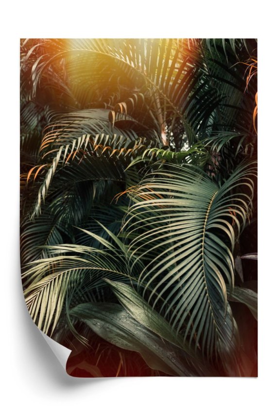 Plakat Głęboki Ciemny Las Palmowy Z Przebijającym Się Słońcem