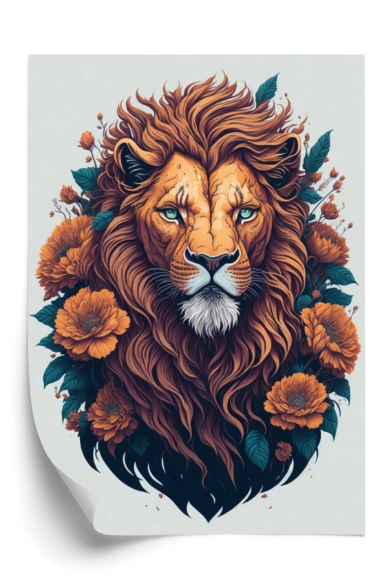 Plakat Głowa Rudego Lwa Z Grzywą I Kwiatami