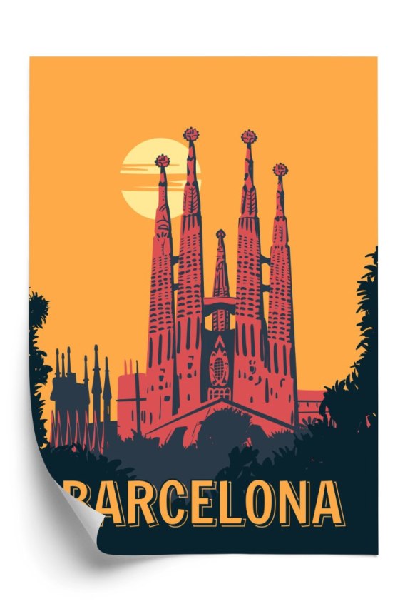 Plakat Kościół W Barcelonie O Zachodzie Słońca W Stylu Vintage
