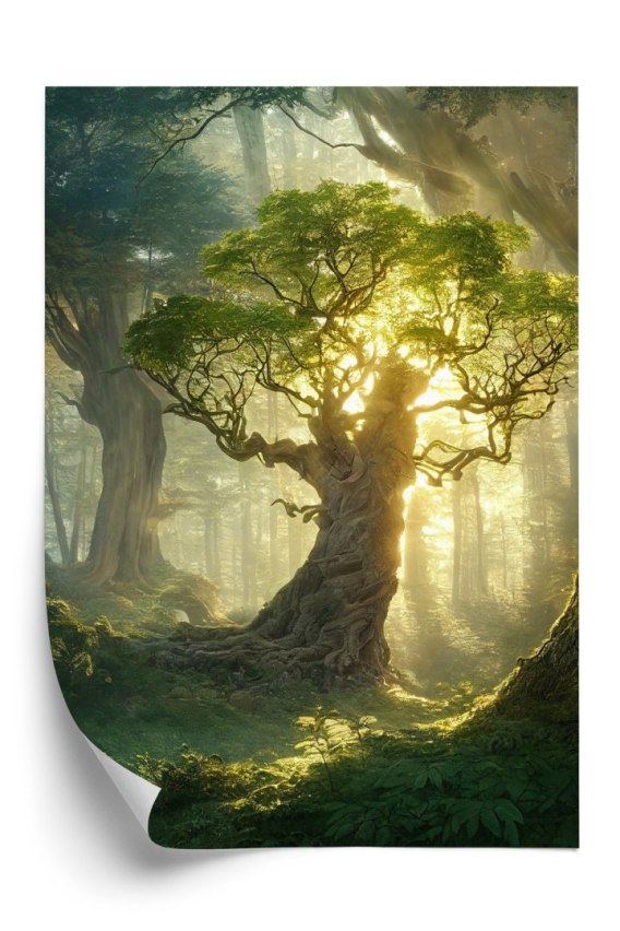 Plakat Kwitnące Drzewo W Promieniach Słońca W Zielonym Lesie