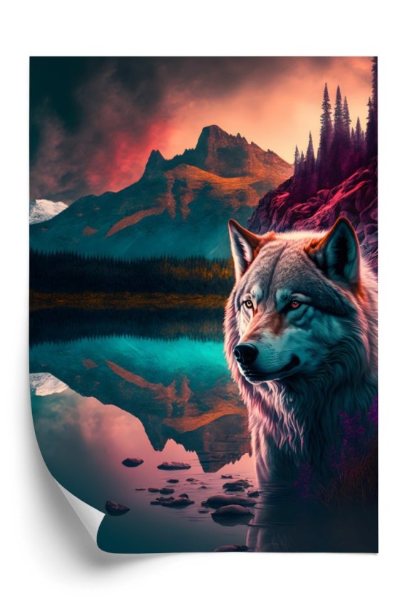 Plakat Majestatyczny Wilk Oświetlony Żywym Kolorowym Światłem W Górach