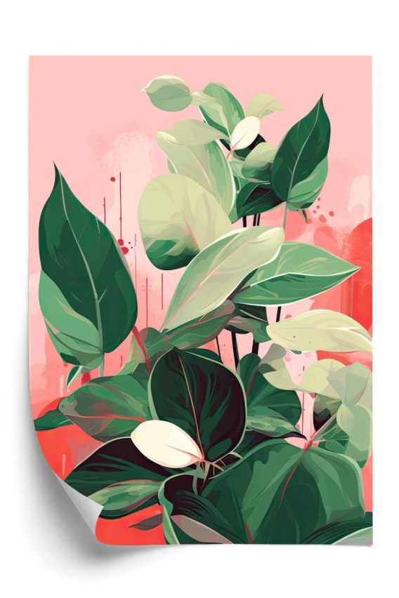 • Plakat Malowane Zielone Liście Roślin Na Różowym Tle