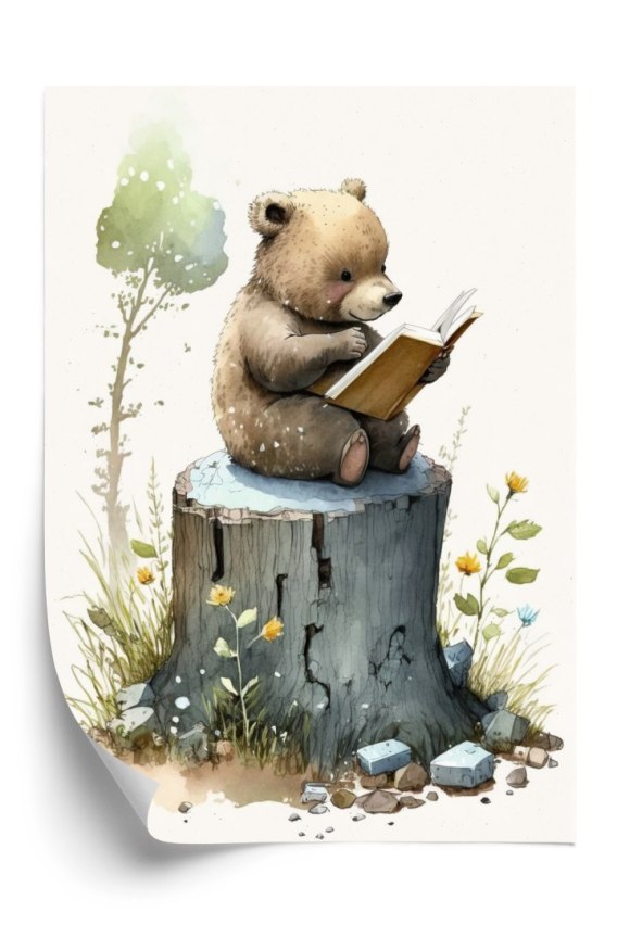 Plakat Niedźwiadek Czytający Bajki Na Pniu Drzewa