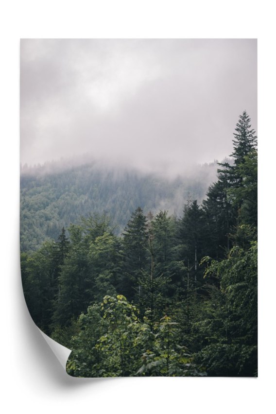 Plakat Poranek W Górach Z Mgłą Nad Zielonym Lasem