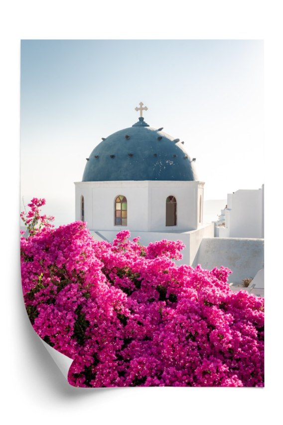 Plakat Typowa Architektura Santorini I Kwitnąca Bugenwilla