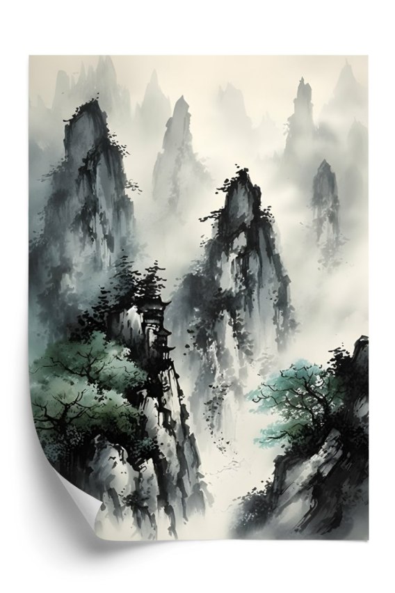 Plakat W Stylu Japońskim Mglisty Poranek W Górach