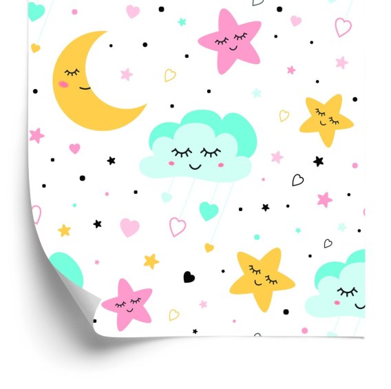Tapeta Dla Dzieci - Kolorowe Śpiące Gwiazdki, Chmurki I Księżyce