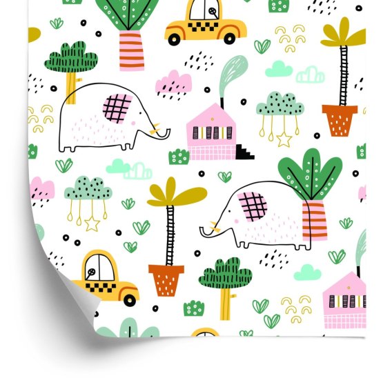 Tapeta Dla Dzieci - Słonie, Autka I Domki W Stylu Skandynawskim
