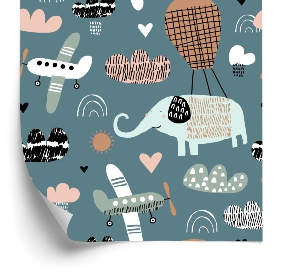 Tapeta Dla Dzieci - Słoniki, Samoloty I Chmurki W Stylu Skandynawskim